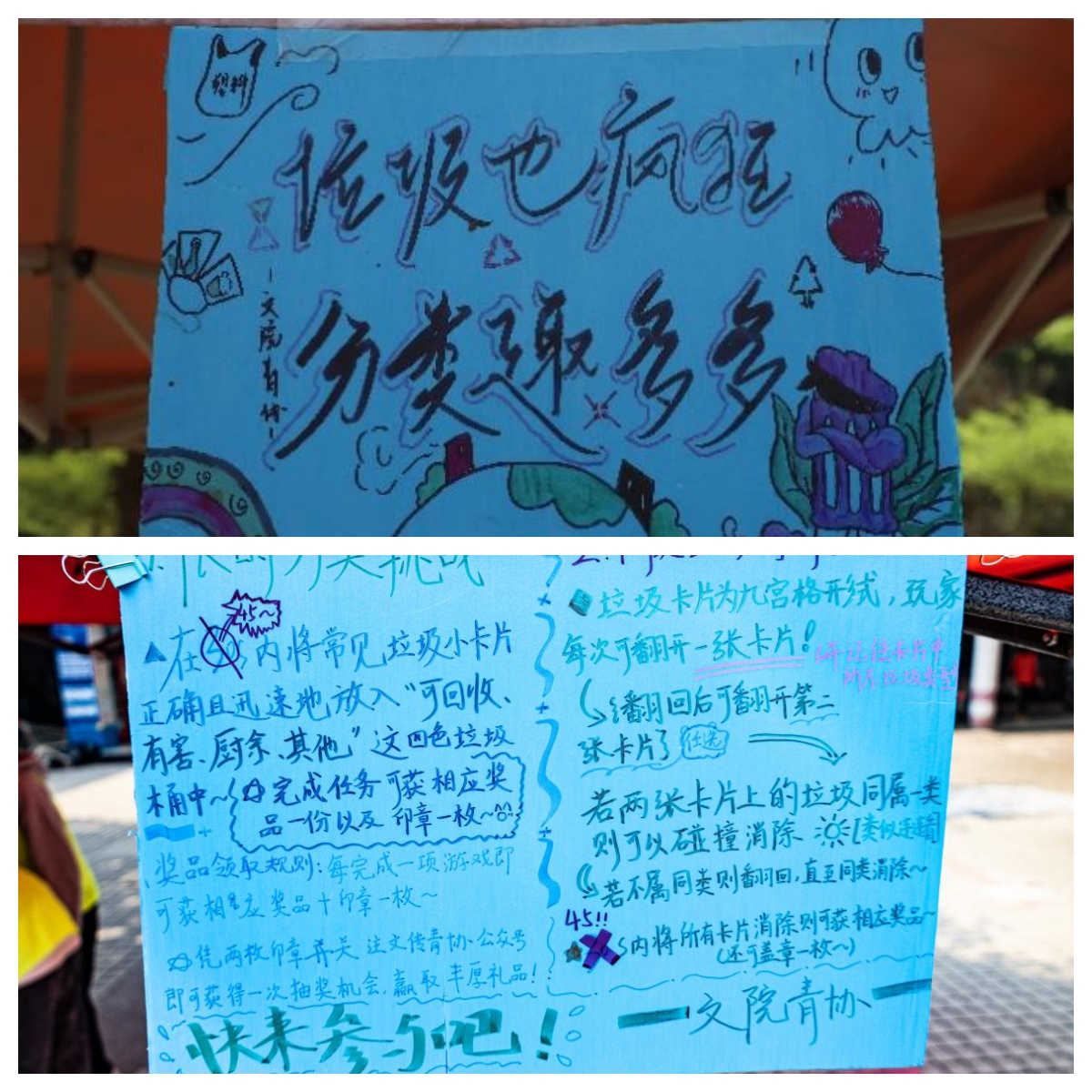 4月2日下午,志愿者们分别在第四饭堂与商业中心布置好活动场地,活动正式开始。活动现场设置了“限时大挑战”和“垃圾分类对对碰”两大游戏环节。在“限时大挑战”中,参与者需在限定时间内将印有各类垃圾的卡片精准投放至四色分类桶,志愿者们实时讲解易混淆物品的区分技巧。“垃圾分类对对碰” 环节同样精彩,工作人员把垃圾卡片摆放成九宫格形式,玩家每次可以翻开一张卡片并记住卡片上垃圾的类型后翻回,接着再次翻开第二张卡片,若两张卡片上的垃圾同属一类,则可以碰撞消除。成功通关两项游戏的同学可获得抽奖机会,定制垃圾分类冰箱贴、环保桌面垃圾桶等绿色奖品等待胜利玩家领取。