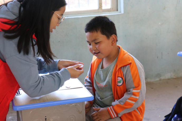 在完成贴画制作后,志愿者们将准备好的贴纸、徽章作为礼物分发给各年级小朋友,并教导他们正确的使用方式。最后,志愿者与小朋友们进行合影留念,活动圆满结束。