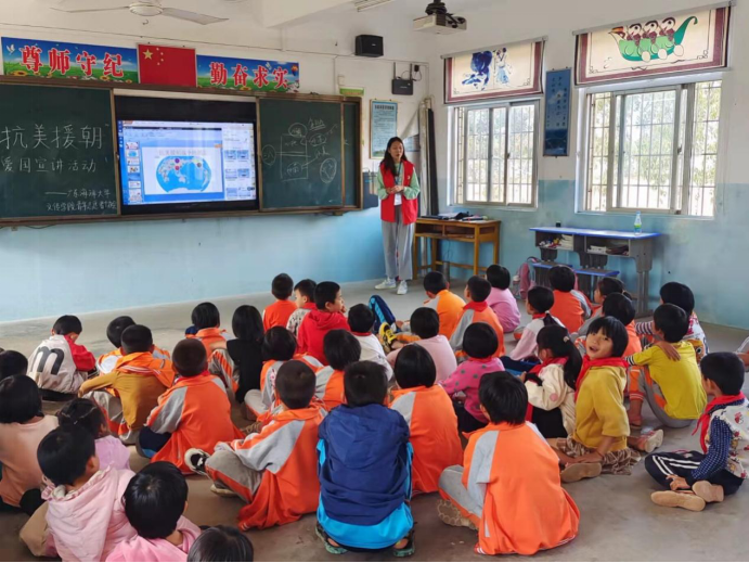 2021年11月10日下午,bevictor1946韦德官网青年志愿者协会一行20余人前往湛江市黄桐希望小学进行“纪念抗美援朝战争”爱国宣讲活动。活动共持续两个半小时,生动的课堂教学和手工环节,既让孩子们气氛十分活跃,也加深他们对抗美援朝历史的了解。