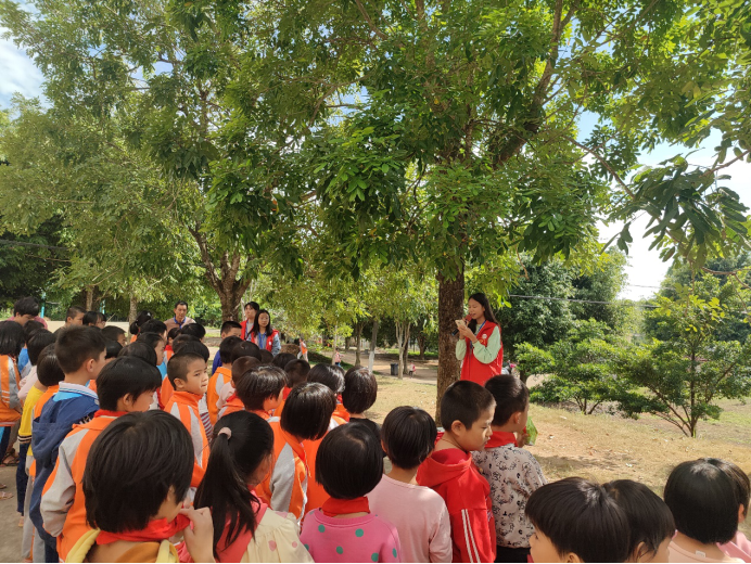 当天下午14:30,孩子们的第一节课准时展开。黄桐希望小学董事长将全校孩子带领到教学楼前空地,与志愿者一同举行奏唱国歌仪式。